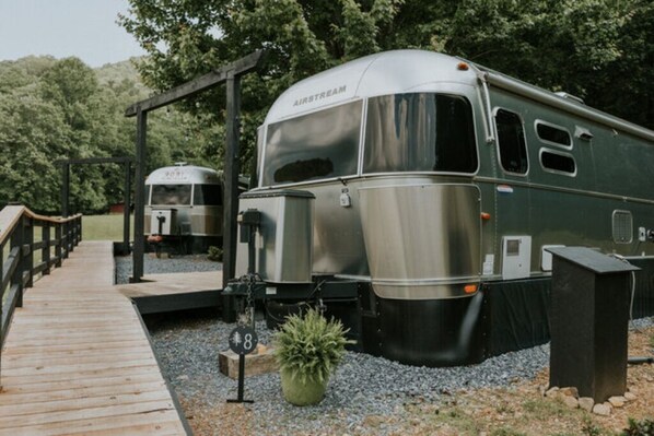 This modern airstream has everything you will need for your escape to the mountains. You will share this 16 acres with 8 other units that offers a small pond, rushing Spivey Creek and beautiful Mountain views. We also have a pavilion with comfy furniture, tables, chairs and a gas fire pit. You are welcome to hang out to meet new friends or gather with your friends and family that are Glamping with you. Bring a lightweight jacket even in the Summer, because we get cool nights.