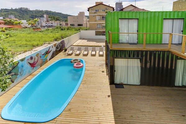 Modern hostel with inviting pool and coworking spaces creates the perfect balance of relaxation and productivity just steps from Canasvieiras Beach