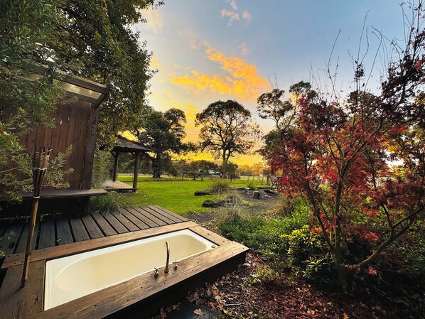 We have added a lovely outdoor bath for you to enjoy the beauty of the night sky whilst soaking your bones listening to the sounds of the night.