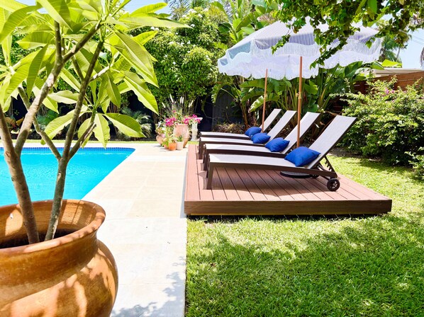 Marigold House - Tropical Getaway w/large yard & heated pool 2 mi from the beach
