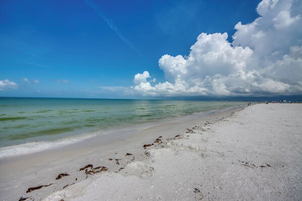 Lovely beachfront unit is located at the South end of Fort Myers Beach Island near Villa Santini Plaza and restaurants. This two bedroom, two bathroom condominium has a King sized bed with a private bathroom, the other bedroom has two twin beds and there is a queen size sleeper sofa. Linens are included! We provide all bed linen, bath towels, hand towels and even a set of towels you can take to the beach. Also, available is your own private balcony and a shared pool. WiFi is available and there is a laundry facility on the property.
