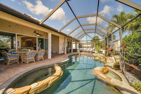 Experience the Gulf Coast at this private 3-bed, 2.5-bath vacation rental nestled in the upscale Pelican neighborhood of Cape Coral! Boasting a tastefully furnished interior with high-end furnishings, ample natural sunlight, as well as a lush outdoor entertainment area with dining space, a gas grill, spa, splash pad, and a screened-in pool, this family-oriented escape has it all! Soak up the sun at the Lighthouse Beach Park, explore Pine Island, or tan poolside at this Coastal Florida reprieve!