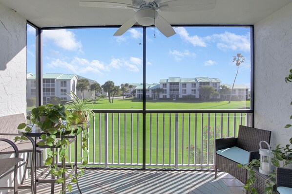 "Barefoot is Better" in this lovely, upgraded 2nd floor 1 bedroom Villa. This condo is spacious, very light and bright! The kitchen is ample and updated with seating for 4 at the bar. The living room offers a queen sized sleeper sofa, ceiling fan and ocean peeks. The screened in balcony overlooks the golf course. The bedroom is outfitted with a King sized bed and a flat screen television for your enjoyment. The bathroom offers updated vanities.