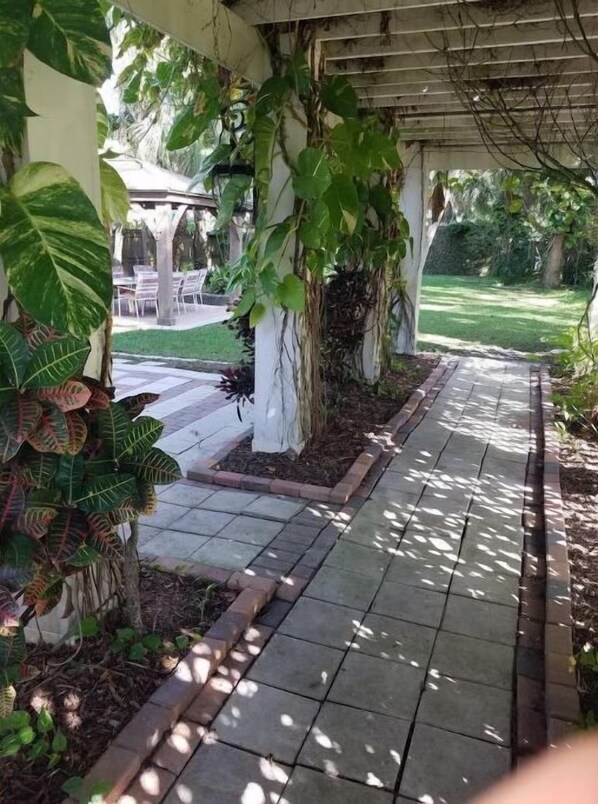 Huge back yard with gazebo and bar-b-que. Large table with seating for 8