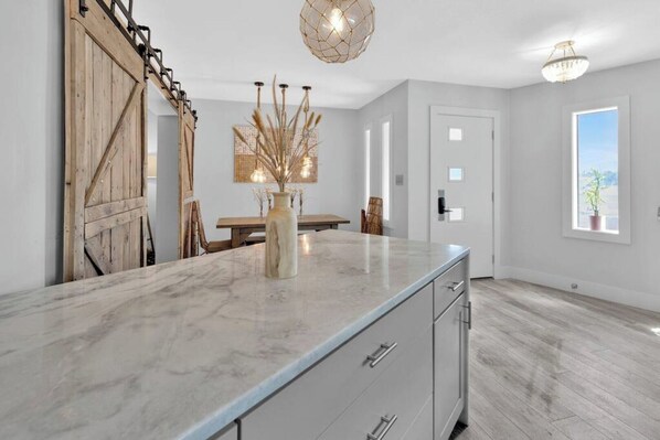 Step inside and be welcomed by custom barn doors leading to a spacious kitchen that's fully equipped for all your cooking needs. With a large French door fridge with an ice maker and freezer, a marble breakfast bar, and a variety of cookware and spices, you'll have everything you need to whip up delicious meals. The living room is the perfect place to relax, with comfortable seating, a 65" smart TV, and Netflix and Spectrum cable.