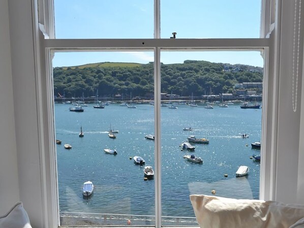 Bedroom 3: 2 x Single (3ft) Beds. Central heating, gas, electricity, bed linen, towels and Wi-Fi included. Travel cot and highchair. Terrace with garden furniture. No smoking.. Roadstead is a fine three bedroom riverfront property offering spacious, comfortable accommodation and superb river views from every room. The ground floor living room stretches the length of the house, with dual aspect windows that frame the water like a pair of bright, shifting paintings. On the lower ground floor, French doors open onto a large sun terrace with sweeping views of the river, Polruan, and the open sea. It’s the sort of place where breakfast drifts into daydreams as boats glide past like lazy brushstrokes.