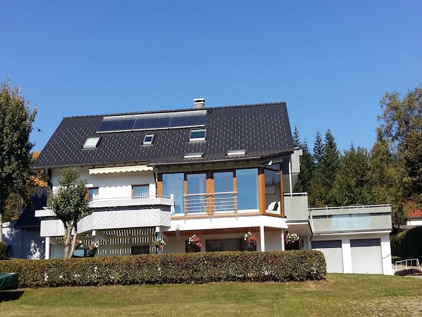 The house sits in a quiet, sunny spot at the forest’s edge—perfect for hiking, biking, and nature walks. In winter, guests enjoy direct access to an illuminated cross-country ski trail and a nearby toboggan run. The apartment is modern and fully equipped, ideal for couples or small families seeking relaxation and adventure.