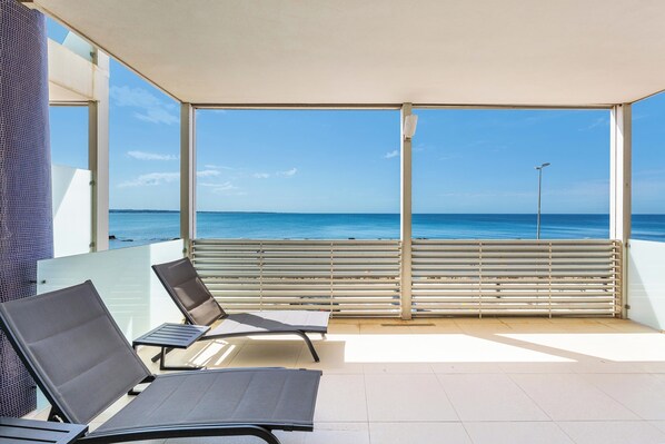The large terrace overlooking the sea is the jewel in the crown of the vacation home, furnished with outdoor lounge, sun loungers, table and chairs for outdoor dining.