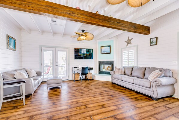 When you find a bit of downtime at home base, the deck will be just the place to fire up the gas grill for cookouts or simply sip a morning coffee or evening glass of wine in the salty air. Step inside, and you will find shiplap accents, coastal decor, and an open concept layout. Entertainment will be easy to find with streaming capabilities and high-speed WiFi, so bring along your streaming accounts and share favorite memories on social media. Everyone can hop into the full kitchen to help out with homecooked meals as well with modern appliances and cookware provided. Extra perks include a private washer and dryer and central AC.