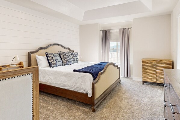 All bedrooms are located upstairs along with a laundry area featuring a washer/dryer. The main suite enjoys an en suite bathroom and a walk-in closet. All bedrooms have smart TVs as well.