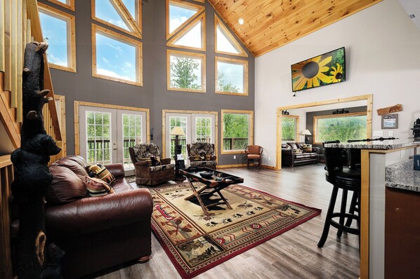 Love natural light and endless views? This is your dream cabin. The living room soars two stories high with a cathedral ceiling. An entire wall of windows frames blue skies and mountain vistas. Golden wood planking on the ceiling reflects the light. Sink onto the buttery-soft leather sofa or lean back in a recliner, and soak up the views. Smile at the whimsical black bear sculptures around the room! A large flat-screen TV is wall-mounted so you get a great view of shows, movies or sports from anywhere in this open plan space.