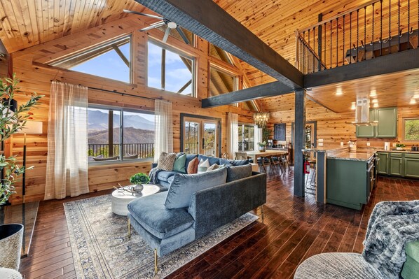 LIVING ROOM ✔ Open space concept ✔ Sofa and 2 swivel accent chairs ✔ Gas fireplace ✔ Smart TV ✔ Access to main deck ✔ Vaulted ceiling and large windows ✔ Ceiling fans