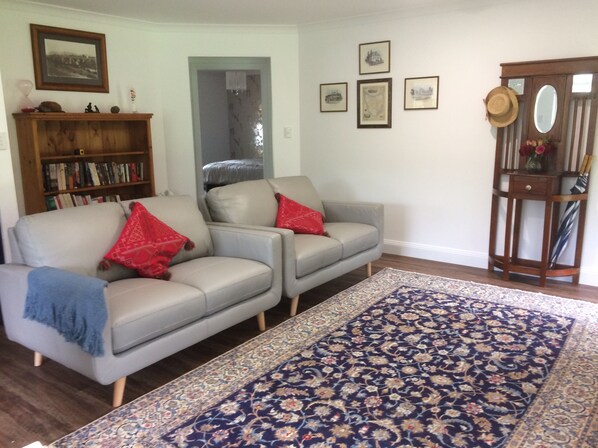 Our cosy lounge with a wood fire also features leather lounges a smart TV, and a quant window seat over looking the water, where our resident platypus play. The stunning views surrounding you will also include visits from our miniature donkey “ Donkey” and Chester our miniature pony, Mo our goat plus the sheep, turkeys, geese, peacock, ducks and chickens, local wildlife and not forgetting our dogs Sheba and Harlow, who give the warmest welcomes. So come soon you won’t want to leave !