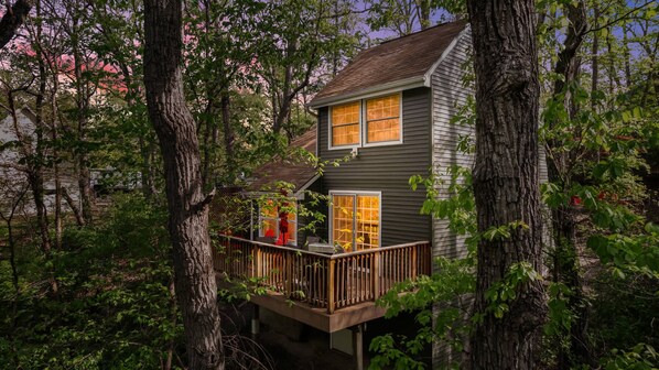 Step onto a spacious deck where string lights create a soft glow at dusk. A fire pit offers a second gathering spot for chilly nights, and a BBQ grill lets you enjoy a warm cookout even when the temperature drops. The surrounding acre of woods invites quiet walks, leaf‑covered paths, and moments of reflection amid the trees.
