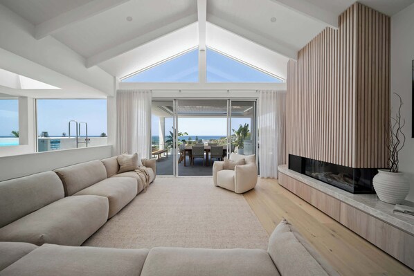 The heart of the house is the open-plan kitchen—a chef's dream with its sleek, contemporary design, high-end appliances, and large island bench perfect for casual dining or entertaining. Adjacent to the kitchen, you’ll find seamless indoor-outdoor living spaces that flow onto an outdoor BBQ area, ideal for alfresco dining while enjoying stunning coastal vistas.