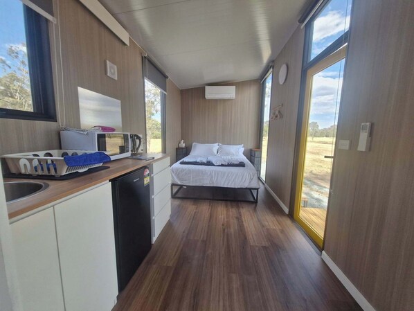 This 139-square-foot tiny home features easy access to water, split air conditioning, a kitchenette equipped for cooking, and excellent bathroom facilities. These amenities include an eco-friendly cassette toilet, hand basin, and gas-heated shower.