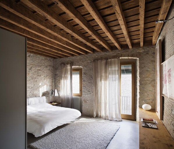 My husband and I and one other couple rented the three bedroom townhouse portion of this property for 6 nights in September. I had read all the reviews and seen the photos. It does not disappoint. My husband is an architect of 30 years experience and its often challenging for him when we travel as he sees the design flaws in everything. There was absolutely nothing he found wanting in this townhouse. It is simply stunning. Very elemental, stone, wood, steel and glass. But there was nothing sterile or staged about the house. It was extremely comfortable to live in. It really felt like staying in someone's home. The location is simply magic. It is located in the heart of the old city, right off a beautiful quiet little square surrounded by a medieval church and the University of Girona's campus located in restored historic buildings off the square. The large balcony overlooks the square. A wonderful place to sit and have a glass wine in the evenings. The house manager Montse was excellent - very helpful on every front. It was hard to leave.