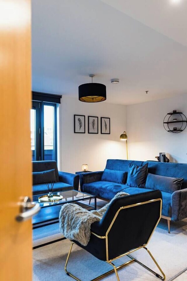 ***Private balcony*** · Large luxury double bed · Two velvet sofa beds in the living area with bedding provided · Luxurious dressing area with hairdryer · Quality fixtures and fittings throughout · Workstation · Nespresso machine and pods · Twinings tea, sugar and milk · Wine selection available for purchase on arrival · Superfast broadband/Wi-Fi · Digital temperature controls · 65" LED Smart TV · Bathroom towels and luxury toiletries by Scottish Fine Soaps · Bath tub · Fully equipped kitchen for self-catering · Washing machine and dishwasher · Luxury umbrellas for Glasgow weather.