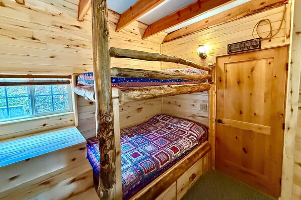 The bunk room has 2 bunk beds, with 2 Queen beds on one bunk and 2 full beds on the other. Upstairs is equipped with an office area and a Queen bed.
