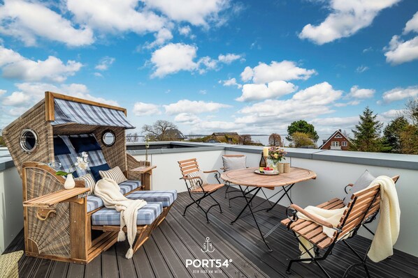 One of the highlights is the fully furnished roof terrace with a fantastic view of the Baltic Sea.