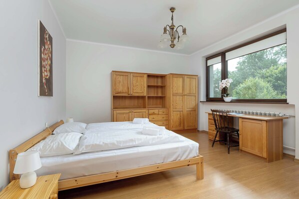 Double bed, wardrobe, desk with chair