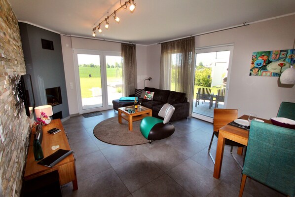 A short summary of the Villa Anima: Outside: - balcony (accessible from the 2 OG-bedrooms) - garden, 2 sun terraces (the main terrace of wood is partially covered by the balcony), outdoor whirlpool incl. Massage jets & LED's in the garden (heated all year 38 °) for sole use - High quality wooden garden furniture (terraces: garden table, 6 chairs, 2 sun loungers, parasol, 2 wooden armchairs + stools) - Exclusive sky lounger in the garden area offers 2 relaxed people outs. - Masonry barbecue in the garden - Private lockable storage shed (z. 2 parking spaces directly at the holiday home: 3 comfortable bedrooms / Sleeps 6 persons: - 2 bedrooms incl. 180 x 200 cm double beds (1 x box spring bed) incl. Suitable for allergy sufferers Bedding (pillows and duvets), wardrobes. Both bedrooms have a balcony access - 1 bedroom on the ground floor (with terrace access) with double bed (180 x 200 cm including high quality mattresses, allerikergeeignetem bedding (pillows and duvets) & wardrobe - 1 Babyreisebettchen (without bedding) bookable on request - 1 bedroom & 1 bathroom are located on the ground floor, so for 2 people no stairs - All bedrooms incl. Wall-mounted Full HD flat screens - windows / doors with electric shutters and insect screen (tenter) 2 luxury daylight bathrooms: - In-house sauna in the first bathroom - 2 daylight baths with floor-level, glazed Raindance showers - the sauna on the first floor also has a bathtub - Both bathrooms incl. Radios (switch series Busch and Hunter / Sauna bath plus iPod docking station) - towel warmer, designer vanities, panoramic mirrors & wall-hung toilets with soft-close living / dining area: - Living area with design furniture, a comfortable corner sofa (blanket is ready), a very comfortable Leolux designer chair and high-quality furniture & access to the sun terraces with adjoining garden - Full HD flat screen (+ SKY TV: Bundesliga, golf tournaments, Formula 1, current films in HD quality) connected with a high-quality soundbar (home cinema system) plus Docking station = pure cinema feeling. Various CD's / DVD's for small and large are also available. - High-quality gas fireplace in the living area, comfortably controllable from the corner sofa via remote control. - Dining area with large dining table & 6 comfortable, high-quality chairs (1 highchair can be booked) Open, fully equipped design kitchen: - Incl. Dishwasher, fridge / freezer, microwave, convection oven with ceramic hob, coffee maker, kettle, toaster & egg cooker. - High-quality dishes, glasses, cutlery, pots, pans and all sorts of other cooking utensils. Further features: - Free DSL-WLAN access. - Underfloor heating throughout the house, per room adjustable. - High quality floor tiles (porcelain stoneware) & cassette doors throughout the house. - Insect protection (stenter on windows & terrace / balcony doors). - Electric blinds throughout the house. - Storage room in the EC incl. Washing machine (powder please bring your own). - Laptop safe, vacuum cleaner, clothes horse. - Various books, CDs, DVDs, board games for small & large. Other: - Non smoking house, smoking is def. only permitted outdoors. - Pets are not allowed in this holiday home.- Linen (sheets & towels sets) pp optional bookable - Special conditions Golf Club Fleesensee. - discounts on bike rental (within walking distance). - On-site support for questions or problems. - bread delivery service of a local bakery.