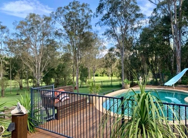 Guests can access the tiny home and the outdoor space surrounding it. Enjoy the saltwater pool, stroll through the property, and follow the path down to the Albert River.