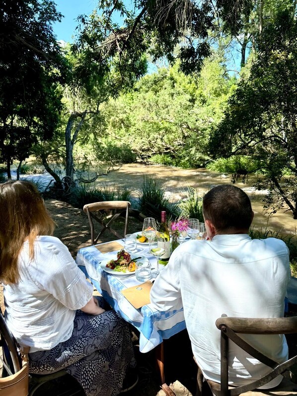 Kangaroos wander through, goats and chickens add plenty of personality, and Banjo, the farm dog, makes a loyal host. The Albert River runs along the back of the property, while Cedar Creek Falls, Tamborine National Park, Kooroomba Vineyard & Lavender Farm, and the famous Glow Worm Caves are all within easy reach.