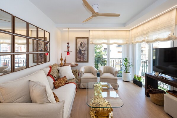 The interior of the apartment blends modernity and comfort with a touch of Andalusian charm. The living room is bright and cozy, ideal for gatherings or moments of relaxation. The fully equipped kitchen makes it easy to prepare meals for the entire group. Each of the bedrooms has been designed to offer maximum comfort, with high-quality beds ensuring a restful night's sleep.