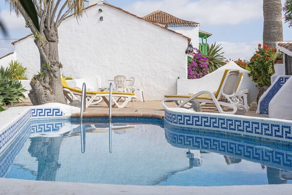 Conjunto de casas de arquitectura tradicional Canaria de gruesos muros de piedra recubiertos y pintados de blanco con carpintería de madera en color verde que dialoga con los jardines de vegetación autóctona, la cubierta es de artesonado de madera con terminación exterior en antigua teja árabe, suelos de barro y mobiliario rustico. Vistas espectaculares del amanecer con el mar de fondo hacia el este y de las montañas hacia el norte. Tiene zonas privadas de aparcamiento barbacoa, piscina,terrazas solárium y jardines. Se encuentra entre los municipios de San Isidro y Granadilla de Abona a 345 m de altitud muy cerca de la playas del Medano, Tejita, Montaña Pelada, Cabezo. Una ubicación ideal entre el mar y la montaña. A menos de un 1 km comercios. Cerca de campos de Golf Adeje, Acantilado de los Gigantes, toda la zona sur de Tenerife Los Cristianos y Las Americas. A 7 km del Aeropuerto Sur. - Set of houses of traditional architecture Canaria of thick stone walls covered and painted white with woodwork in green color that dialogues with the gardens of native vegetation, the cover is of coffered wood with exterior finishing in old Arab tile, floors of Clay and rustic furniture. Spectacular views of the sunrise with the sea bottom to the east and the mountains to the north. It has private parking, barbecue, swimming pool, sun terraces and gardens. It is located between the municipalities of San Isidro and Granadilla de Abona at 345 m altitude very close to the beaches of Medano, Tejita, Montaña Pelada, Cabezo. An ideal location between the sea and the mountains. Less than 1 km shops.Close to Adeje Golf Courses, Giant's Cliff, the entire southern area of Tenerife Los Cristianos and Las Americas. 7 km from the South Airport.