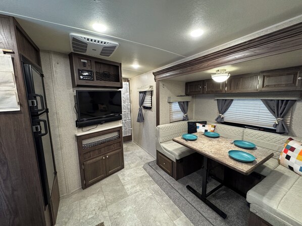 Our RV is equipped with a small full kitchen (oven, stovetop, microwave, fridge, cookware, coffee pot, etc), full bathroom (+ towels), comfortable RV Queen bed, an eating/sitting area that converts to another RV Full bed (+ pillows and linens), TV, AC, Heat and WiFi. If you prefer to bring your own bedding and pillows, that is fine too.