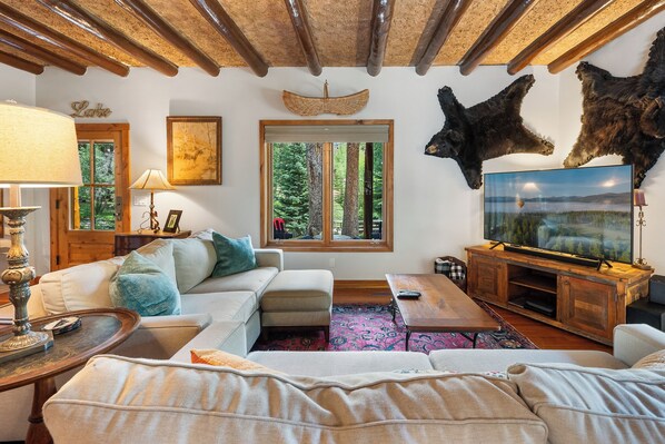 The main level opens into a spacious living room designed for relaxing together after cold-weather adventures. The kitchen is fully equipped and set up for shared meals, with a dining table that works just as well for hearty breakfasts as it does for long dinners. Whether you’re cooking, watching TV, or enjoying a quiet night by the fire, the layout encourages easy time together.