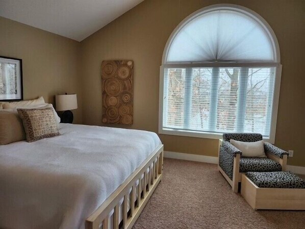 This beautiful two bedroom, two bath, two-story executive condo with a romantic fireplace in the living room with a large flat screen TV overlooking a beautiful pond. Both bedrooms are upstairs and the bedrooms have one king size bed and the other has one queen size bed and a twin size bed. This condo has a large screened in porch deck with very comfortable furniture, gas grill and many extras. This condo is a no pets and non-smoking unit. The owner of this unit occasionally brings their own pet. Our housekeepers work very hard, but we cannot fully guarantee a pet-allergy safe experience.
