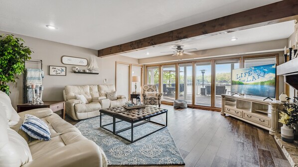 Step outside to enjoy two spacious decks with ample seating for dining and relaxing by the water. The private dock includes a 12x30 boat slip, swim platform, swim ladder, and space to enjoy time on the lake. Guests can explore the cove and main channel using the provided kayaks and paddle boards or unwind in the hammock and lakefront fire pit after a full day outdoors.