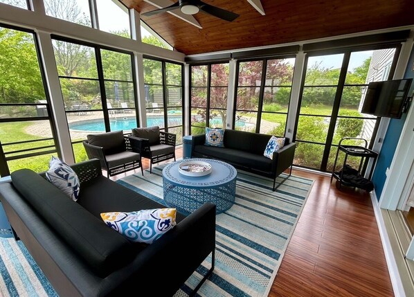 Main Floor: You enter the house into the well organized foyer with plenty of storage for your outdoor gear. The large living room has a sofa and chairs and a gas fireplace, perfect for cozy nights. The Kitchen is well-equipped, with all stainless Bosch appliances: gas range, dishwasher, large refrigerator and microwave along with many small appliances including a toaster, blender, standard drip coffee maker, food processor, Kitchen-Aid mixer, a wet bar and more. The well organized pantry and laundry room, just adjacent to the kitchen has its own entrance to the backyard patio and pool area so meals, poolside, are a breeze. The dining room table seats 8 with an extra leaf available. There is also additional counter seating for four 4 more. The screened sun porch, located just off the dining room, has both screens and windows, so you can be comfortable and use it for 3 seasons out of the year. There is ample seating and a TV for your viewing pleasure. The sun deck, located on the side of the house, offers guests great views while dining or lounging in one of the chairs. There is a dining table that seats 8, an umbrella, and 4 lounge chairs to soak up the rays.