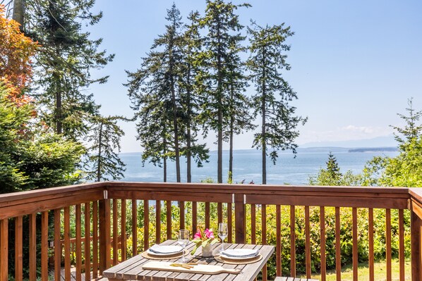 Perched on the west-facing bank between Freeland and Greenbank, this cozy cottage occupies one of the most extraordinary locations on Whidbey Island. Offering sweeping 180-degree views of the Sound and Olympics, there's also a private stairway (rebuilt in 2020) leading to over 4 miles of sandy walking beach. This cottage is a dream retreat for couples, families, and artists seeking inspiration and tranquility.