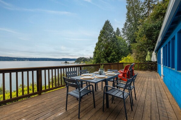 Inside, you`ll find two cozy bedrooms accommodating up to 6 guests, each adorned with furnishings for a nostalgic touch. The sun soaked living space features a comfortable sofa, seating and large table for dining or puzzling. Use the binoculars provided to search for Bald Eagles and sea life! The well-equipped kitchen includes a fully functional original 1940s vintage stove, while having everything you need to prepare meals so you never have to leave. You’ll love the recently renovated bathroom, with charming wallpaper and equipped with all the amenities you will need for your stay. Dine indoors or take advantage of the expansive deck and Adirondack chairs, complete with a BBQ grill. Please note we intentionally do not have a television to truly unplug and unwind, but we do have internet access if you would like to bring your own device.