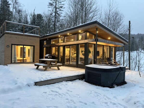 At only 1h15 from Montreal, Le Frāho luxurious cabin is the perfect getaway space for one, two or three couples or a small family. Not only it is surrounded by majestic floor to ceiling windows, it does not have any neighbours, it features 2 queen-sized bedrooms with spacious private walk-in closet, a contemporary bathroom, a fully equipped open concept kitchen/dining and living room area, a comfortable sofa bed, modern furnishings, a large rooftop terrace, a spa, a grand terrace with a complete patio set and an outdoor fireplace.