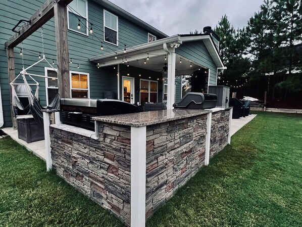 Come back from a day at the Master's and relax outside in the fully fenced back yard, offering a outdoor kitchen with a gas grill and blackstone. Relax under the covered sitting area with a wood-burning fireplace (firewood not provided) and a 55" mounted t.v, plus dining seating for 6.