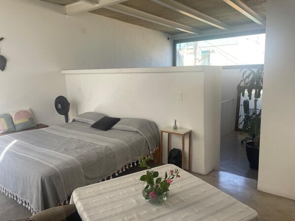 The Apartment has everything you need for a short stay, microwave, fridge, coffe maker, desk to work, smart TV and king size bed. On the ground floor there is a sofa bed . One full bathroom in te bedroom. Very comfortable and close to a Nice Market where you can find a loundry, food, fruits, drugs store, oxxo, etc.