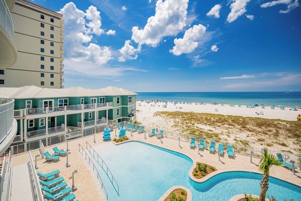 • Stunning views of the Gulf, pool, lazy river, and waterslide