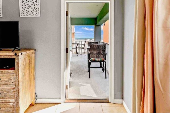 Large wrap around balcony with great views of the gulf. Seating available to eat outside or enjoy your morning coffee. Direct sun throughout the day along with an overhang for shade when needed. Sit and listen to the ocean at night with your favorite beverage.