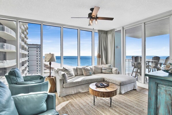 - Panoramic Gulf Views: Floor-to-ceiling windows in the living room showcase the sugar-white beaches and turquoise waters of the Gulf of Mexico.