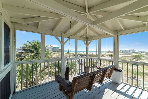 This private beach house offers three bedrooms and two full baths. The master is a large open room with a king bed and a queen pullout sofa. It also has a seating area next to french doors that open to a beach facing patio. The master bath is also where the laundry room is. The two guest rooms have queen beds in them and share a full bath with a stand up shower. The den area is open in the center of the house with windows facing the beach and patio with Gulf views and palm trees swaying in the wind. In the den you will find a queen size pullout sofa and 2 comfy recliners to watch the smart TV from. The kitchen is full size and well stocked to cook all of your meals from. Why eat inside when you have a large picnic table on the patio with a Gulf view? There is also the best little screened in porch facing the water with a swing to relax and listen to the seagulls while watching the waves crash in the distance.