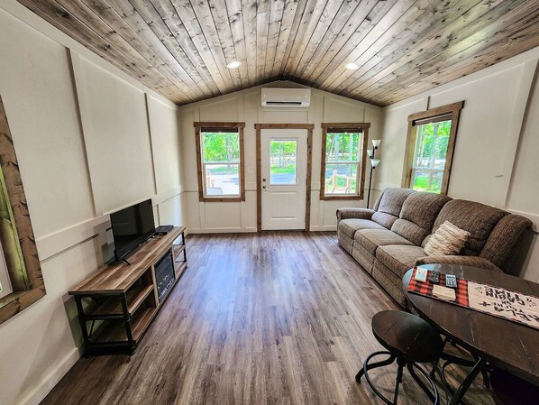 Cozy and quiet, this tiny house cabin will prove to be your new favorite getaway! This cabin proves to be the perfect outdoor retreat you are looking for with all the amenities you need. Our modern tiny house cabins are the perfect place to relax, though adventure can be found just around the corner. Our 670+ acre property sits right on Lake Guntersville. Guests can access the waterfront by use of our private roads. The cabins are tucked into the woods, not directly situated on the water. Boat parking with battery hook-ups are available. All cabins have full size kitchens, stocked with basic cookware. We ask that you wash and replace any items used during your stay. The cabins are supplied with bedding and bath linens to accommodate four. If you would prefer not to reuse bath linens, you can pack your own or request more at an additional fee. All rates include 4 guests and 2 vehicles.