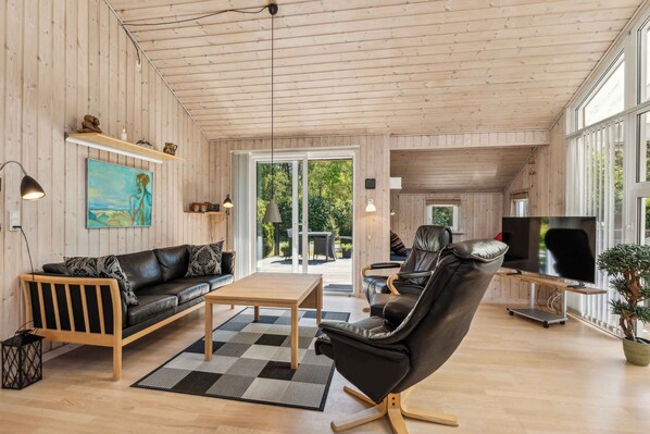 Inside, the holiday home features a spacious kitchen/living area with a vaulted ceiling that gives a sense of airiness and space. Skylights provide plenty of natural light, and the exits to the partially covered wooden terrace beautifully connect indoor and outdoor living. The living area includes a bright kitchen, a cozy dining space, a seating corner, and a charming alcove inviting relaxation and togetherness. When the evenings turn cool, you can light the wood stove and enjoy the warmth, or use the efficient heat pump, which ensures a comfortable temperature throughout the house. A ceiling fan also distributes the heat to other rooms so you can enjoy comfort no matter where you are.