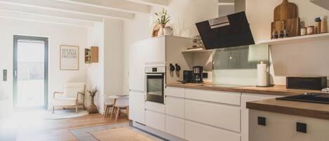 Fridge, microwave, oven, stovetop - High-quality 100sqm vacation home for 6 people with fireplace and garden directly on the dike (Hilgenriedersiel/Hagermarsch)