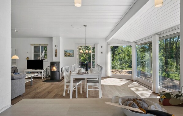 Welcome to this inviting holiday home, where you can enjoy a relaxing break with your loved ones not far from the coast. Prepare your favourite dishes in the open-plan kitchen and light the wood-burning stove for harmonious meals with a view of the countryside. After a long day in the fresh sea air, you can make yourself comfortable on the cosy sofa with a good film or book.