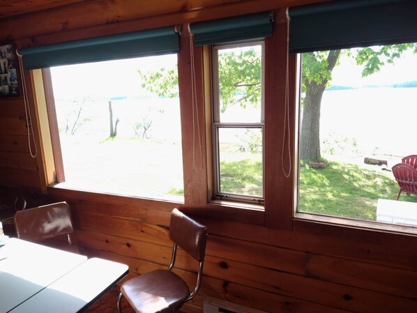 1 bedroom lakeview cabin with a kitchen and screened-in porch in "The Highlands." A few extra steps from the water with an UNBELIEVABLE view. Features one bedroom with queen bed and 2 twin beds in the main room that can be "bunked up" or "bunked down". We no longer provide cots, but there's plenty of room for you to bring your own air mattress. Please bring your own linens and towels. We provide cookware/utensils, flatware, cups, plates, dish soap and sponges, paper towels, and toilet paper. Coffee, soap, shampoo, and conditioner are available at no charge upon request. In order to keep our nightly rate low, a one-time housekeeping fee of $115 will be added to each reservation, regardless of the length of your stay.
