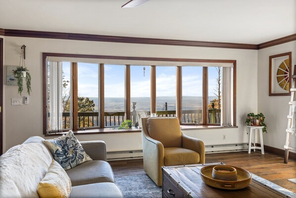 Perched atop a mountain, Mountain Mama Vacation Homes boasts sweeping views of the Shenandoah Valley. Stained glass windows and marble accents add to its unique charm, while an expansive interior offers ample space for gathering inside and out. Unwind by the fire pit as sunset falls over the valley or explore nearby attractions like Appalachian Trail access just a mile up the road.